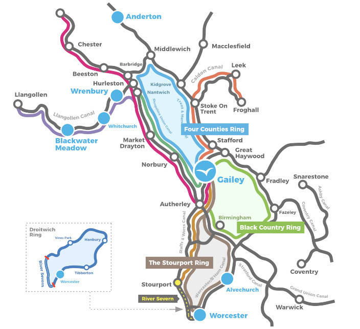 - Gailey is ideally placed for this ring that takes you on the Staffordshire & Worcestershire Canal, through the waterfronts of Birmingham via the new Main Line, onto the Birmingham & Fazeley and the Trent & Mersey.