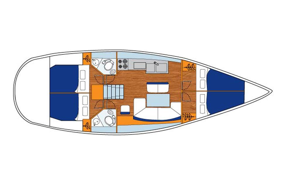 Denne Jeanneau 44i Premier med to ratt har fire dobbellugarer og 2 toaletter - det kan være opptil 10 personer om bord. Båten er bygget og designet av franske Jeanneau. Den er en høy-ytelse cruising yacht bygget for komfort og designet for seilere på jakt etter moro seiling - en seilbåt som også kan manøvrere i åpent vann, og kombinerer formidabel utstyr med god ytelse.