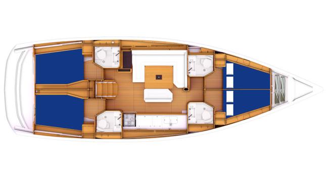 Denne Jeanneau 47 Premier med to ratt har fire dobbellugarer og 4 toaletter - det kan være opptil 10 personer om bord. Båten er bygget og designet av franske Jeanneau.