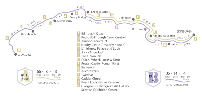 The Glasgow route follows the Forth & Clyde Canal with seven locks each way. It winds through idyllic countryside, in several swing bridges and past the villages Auchinstarry and Kirkintilloch, who is said to have more churches than pubs. Glasgow with fine shopping and the historic Cathedral is the target of this holiday itinerary.